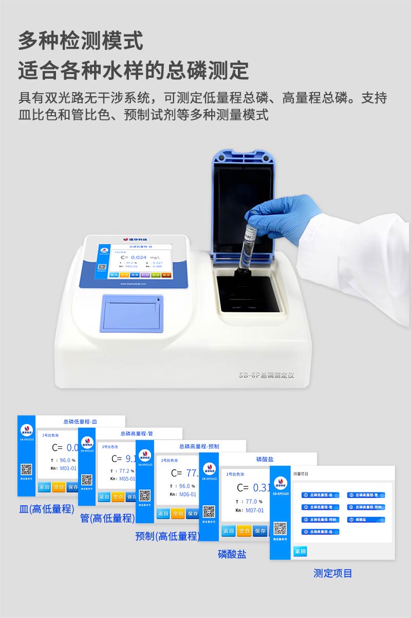 1、多種測定模式:具有雙光路無干涉系統,可測定低量程總磷、高量程總磷。支持皿比色和管比色、預制試劑等多種測量模式;